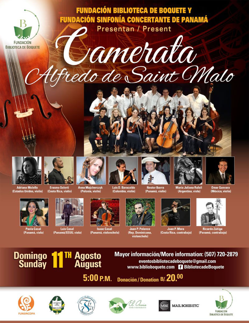 Camerata Alfredo de Saint Malo « Todos los Eventos Este evento ha pasado. Camerata Alfredo de Saint Malo 11 agosto, 2019 @ 5:00 pm - 8:00 pm B/.20 « Gran Concierto por Chiricanos en Italia Entrega de Donación Bibliografica » + Google Calendar+ Exportar iCal Detalles Fecha: 11 agosto, 2019 Hora: 5:00 pm - 8:00 pm Precio: B/.20 Lugar Biblioteca de Boquete Boquete Panamá + Google Map